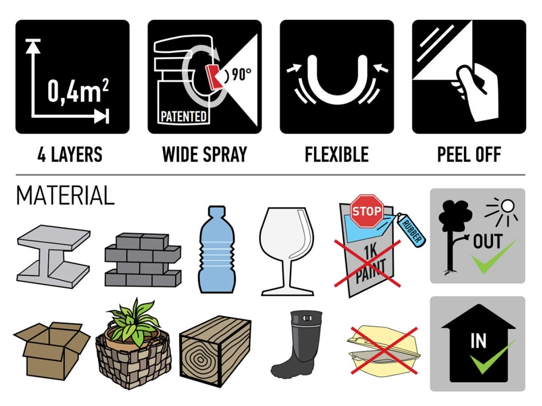 Chroni przedmioty przed wilgocią, kwasami, przetarciami, korozją oraz poprawia przyczepność (np.  chwyt młotka). ROUBBER Comp pozostaje elastyczny i rozciągliwy z upływem czasu i nie pęka ani nie staje się kruchy w ekstremalnych warunkach pogodowych. Powłokę łatwo można zdjąć. Cztery warstwy są wymagane, aby otrzymać powłokę zalecanej grubości. Kolory neonowe nie mają ochrony przed UV.