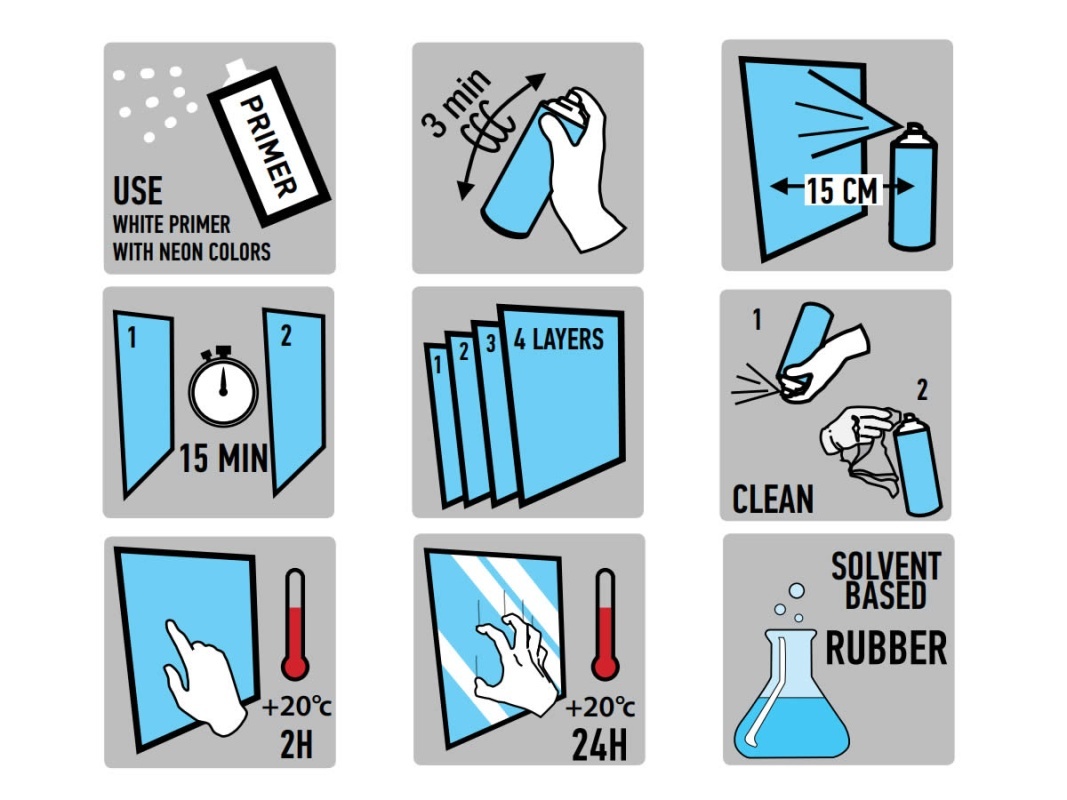 • Po nałożeniu każdej warstwy wyczyść dyszę aerozolu poprzez odwrócenie puszki „do góry nogami” i wciśnięci dyszy do momentu gdy  będzie z niej wylatywał czysty gaz