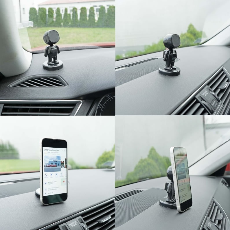 Uchwyt wykonany z tworzywa PC z wbudowanym magnesem zapewnia pewne trzymanie urządzenia nawet podczas jazdy po nierównościach. Figurka ma wysokość 9,5 cm i dzięki kompaktowym wymiarom pasuje do każdego wnętrza auta. Świetnie prezentuje się na desce rozdzielczej – wygląda jak mini figurka astronauty.