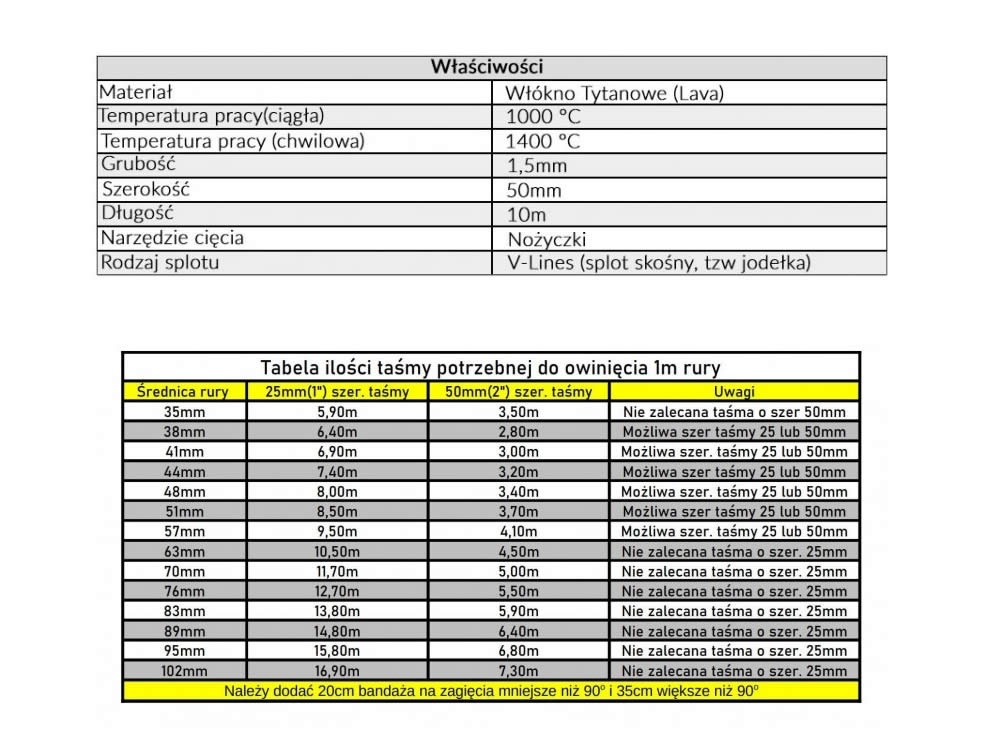 Bandaż nie zawiera azbestu, wykonany jest z wysokiej jakości bazaltowej przędzy odpornej na chemikalia, kwasy, wodę ,grzyby, a ponadto jest niepalny.