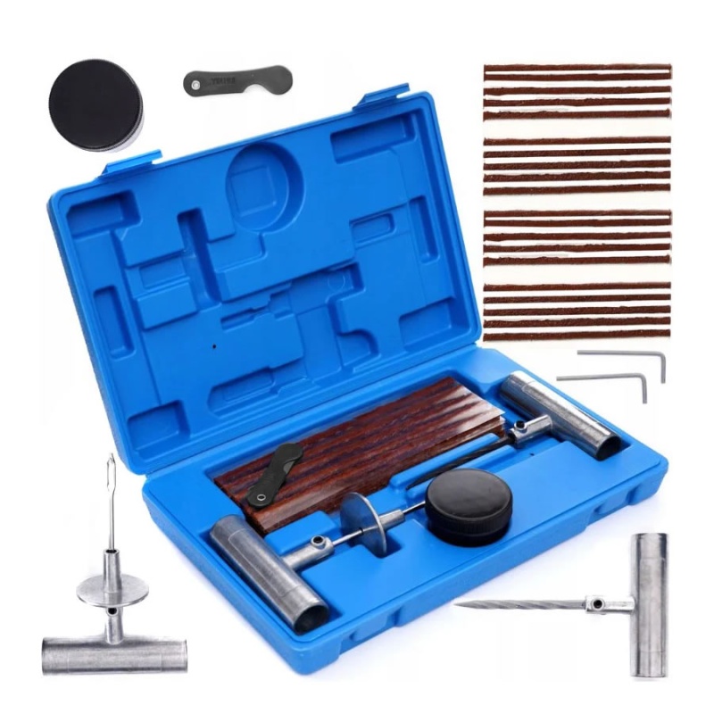 Zestaw do naprawy opon samochodowych. Komplet jest prosty w obsłudze i uniwersalny. Umożliwia naprawę opony w kilka minut.