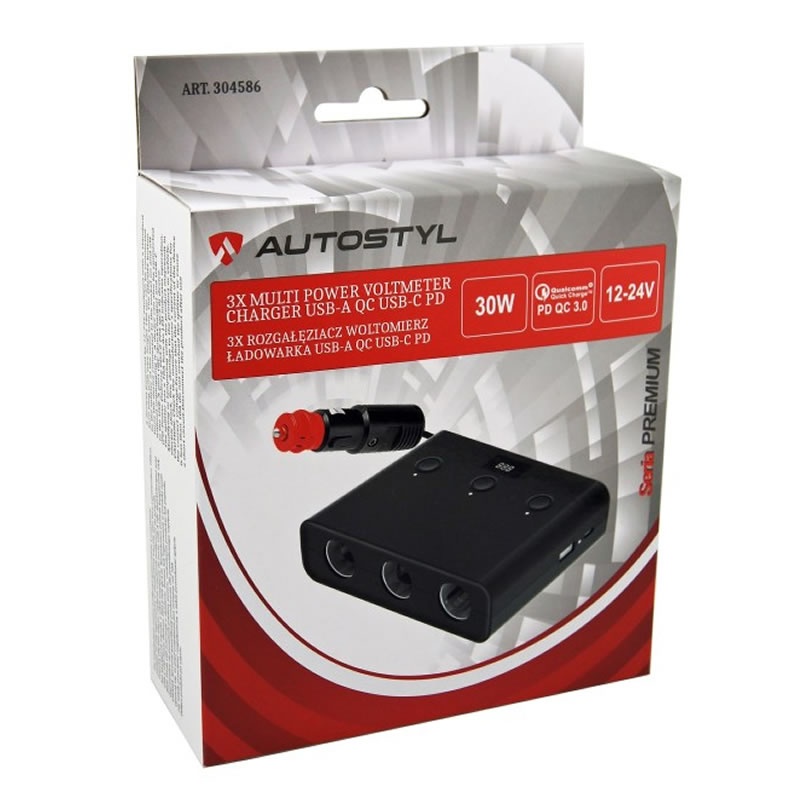 ROZGAŁĘZIACZ ROZDZIELACZ GNIAZDA ZAPALNICZKI 3 gniazda EURO PREMIUM + ŁADOWARKA USB C PD 30W