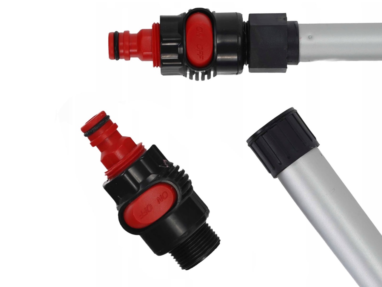 Konstrukcja umożliwia podłączenie do węża ogrodowego, dzięki czemu woda doprowadzana jest bezpośrednio przez kij do głowicy.