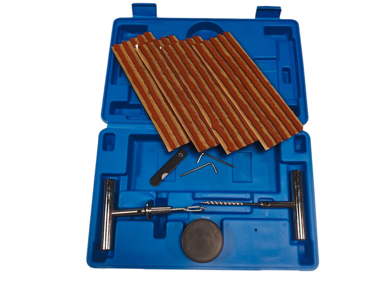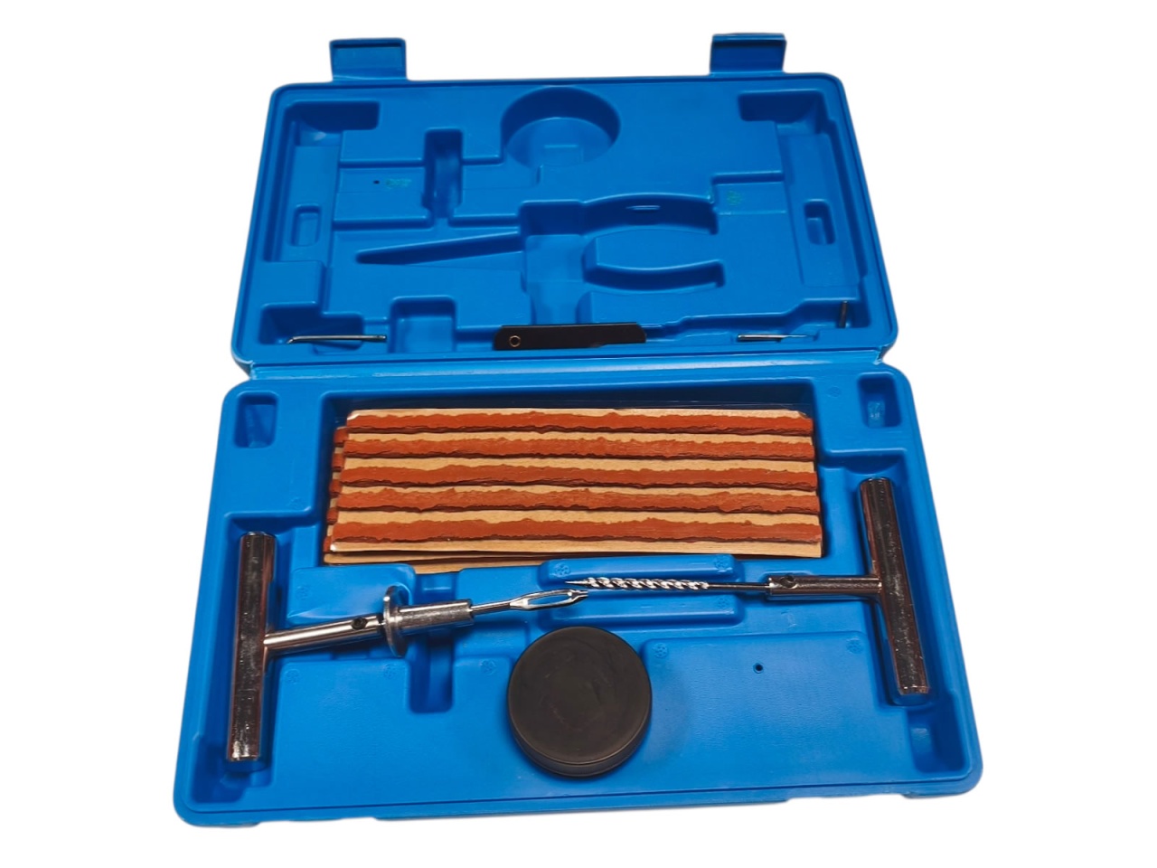 Zestaw do naprawy opon samochodowych. Komplet jest prosty w obsłudze i uniwersalny. Umożliwia naprawę opony w kilka minut.