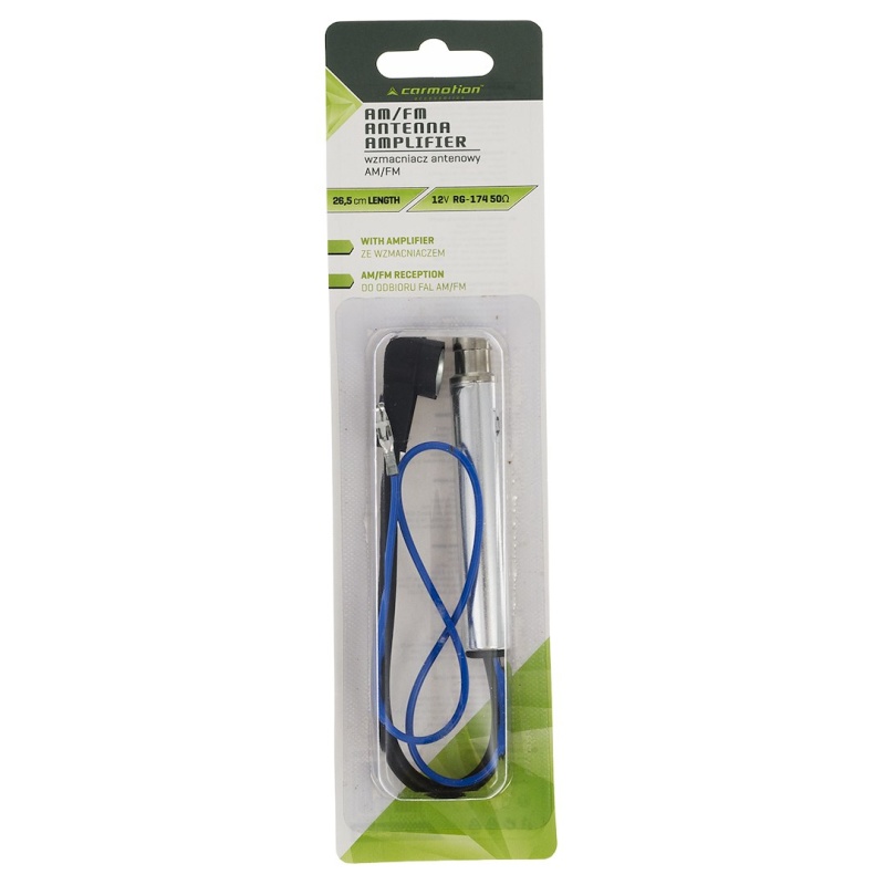 Bardzo wydajny wzmacniacz samochodowy z końcówką typu DIN. Wzmacnia sygnał radiowy przez co poprawia jego jakość oraz moc - wzmacnia zarówno fale AM jak i FM. Montaż typu Plug&Play - wystarczy wpiąć końcówki pomiędzy antenę a radio samochodowe.