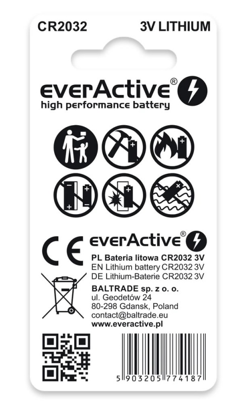 Baterie guzikowe everActive CR2032 to połączenie wysokiej jakości wykonania, długiej żywotności oraz pełnej zgodności z aktualnymi normami europejskimi. To sprawdzony wybór zarówno do codziennych urządzeń domowych, jak i sprzętu specjalistycznego czy medycznego.