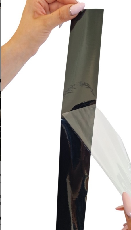 Samochodowa folia czarna połysk do dechromingu z klejem samoprzylepnym oraz bezbarwną ochronną folią którą należy usunąć z powierzchni po aplikacji.