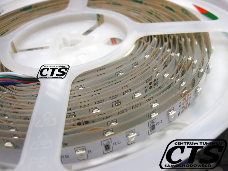 Elastyczna taśma LED, zastosowanie: oświetlanie samochodu, mebli, półek szklanych, wnęk, podświetlenie stopni schodowych i wszelkich elementów architektonicznych. Dane techniczne - rodzaj diod: SMD 3528 RGB EPISTAR, ilość diód: 300, kolor: RGB, długość: 5m, poziom ochrony IP55, napięcie: 12V, moc: 4.4W/m.